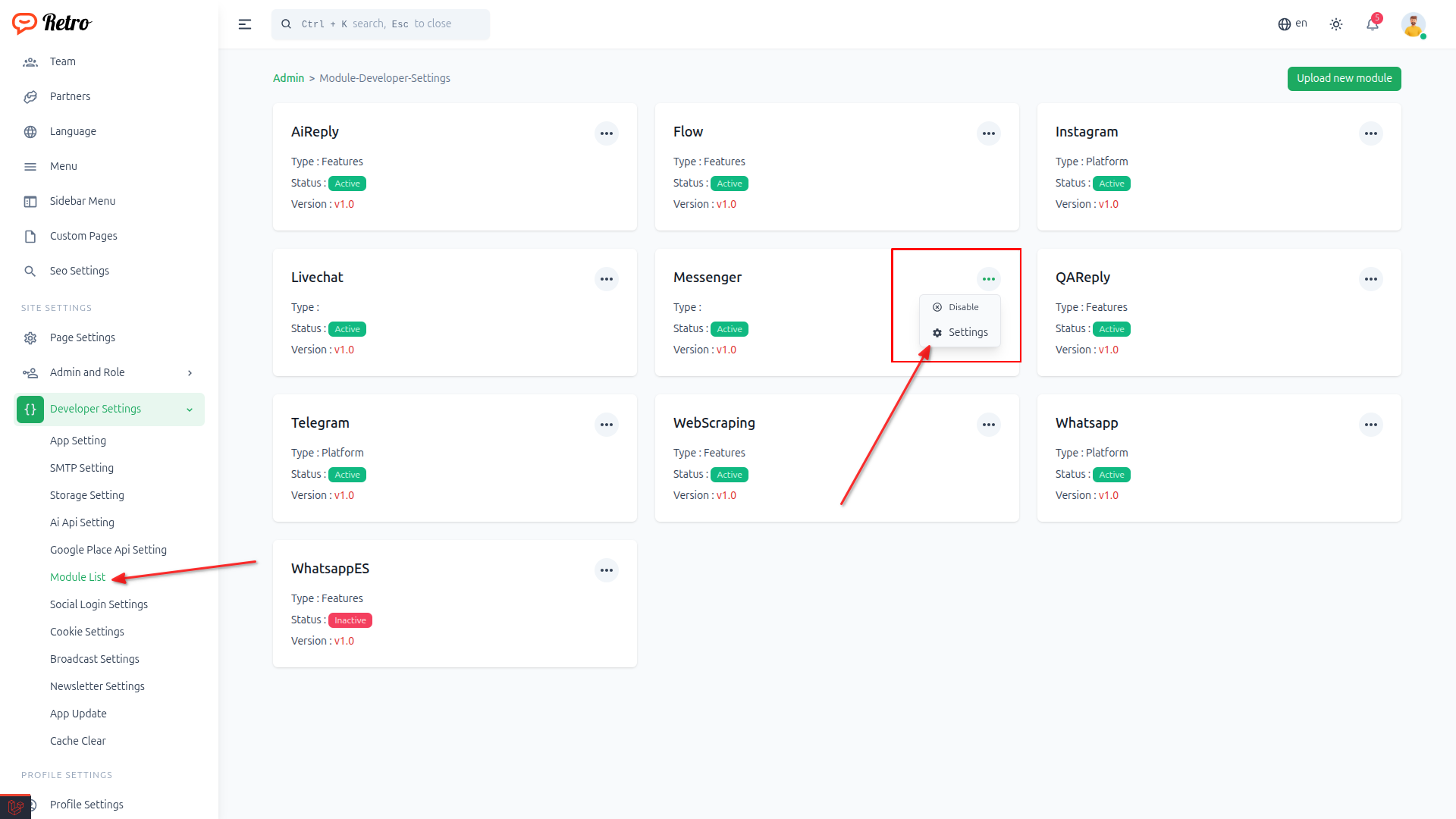 Or navigate to Developer Settings > Module List and click the Messenger Settings option.