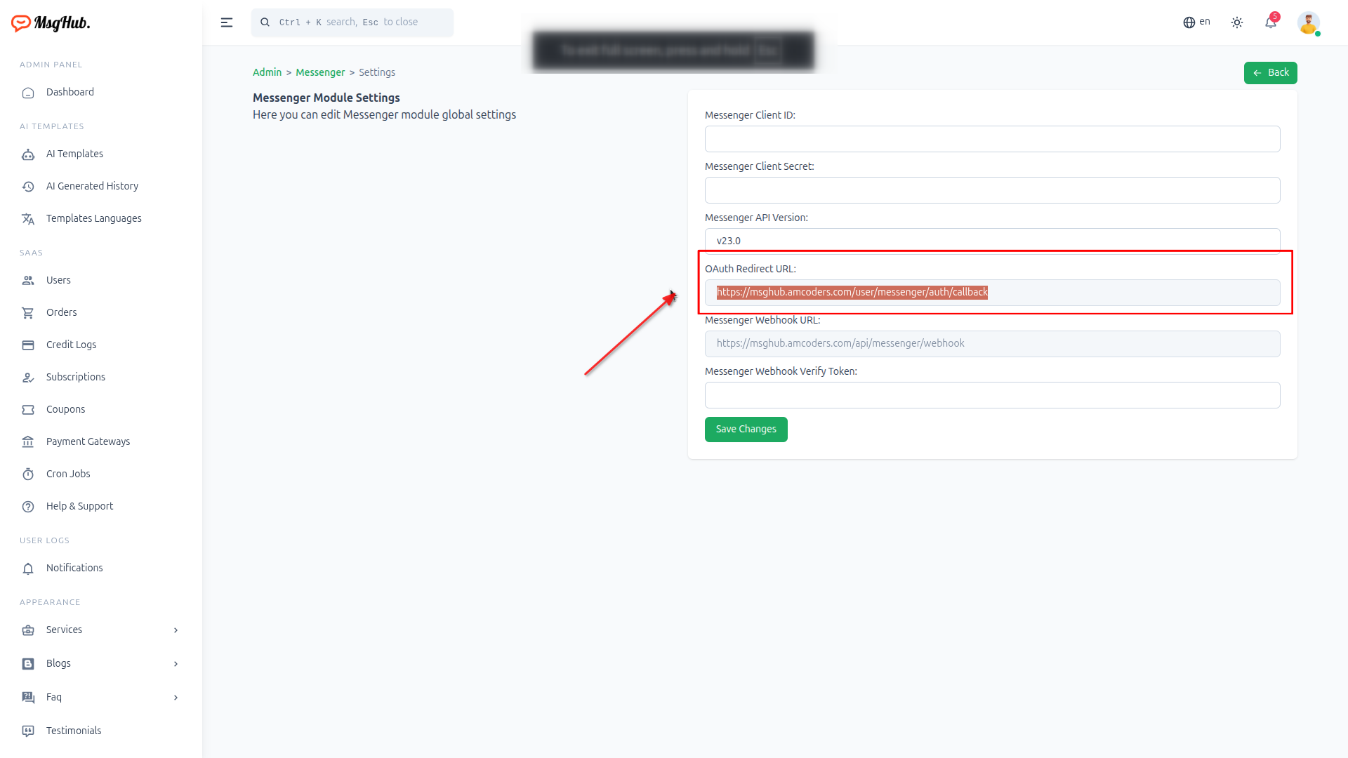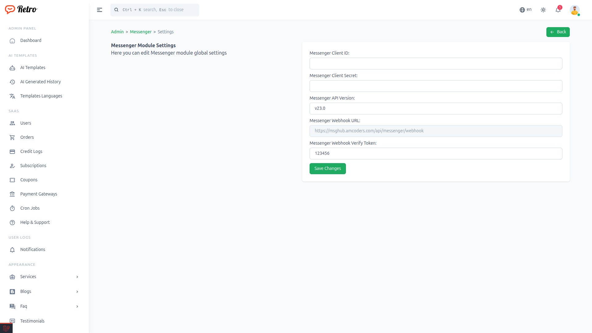 Messenger Module Settings page