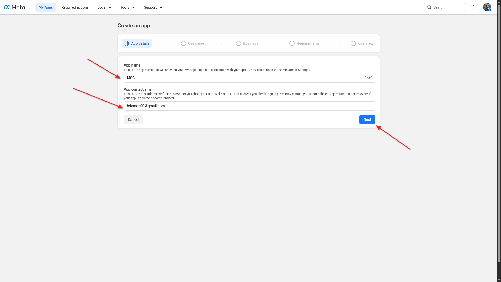 Enter your app name and contact email
