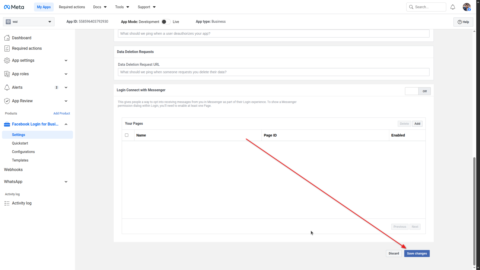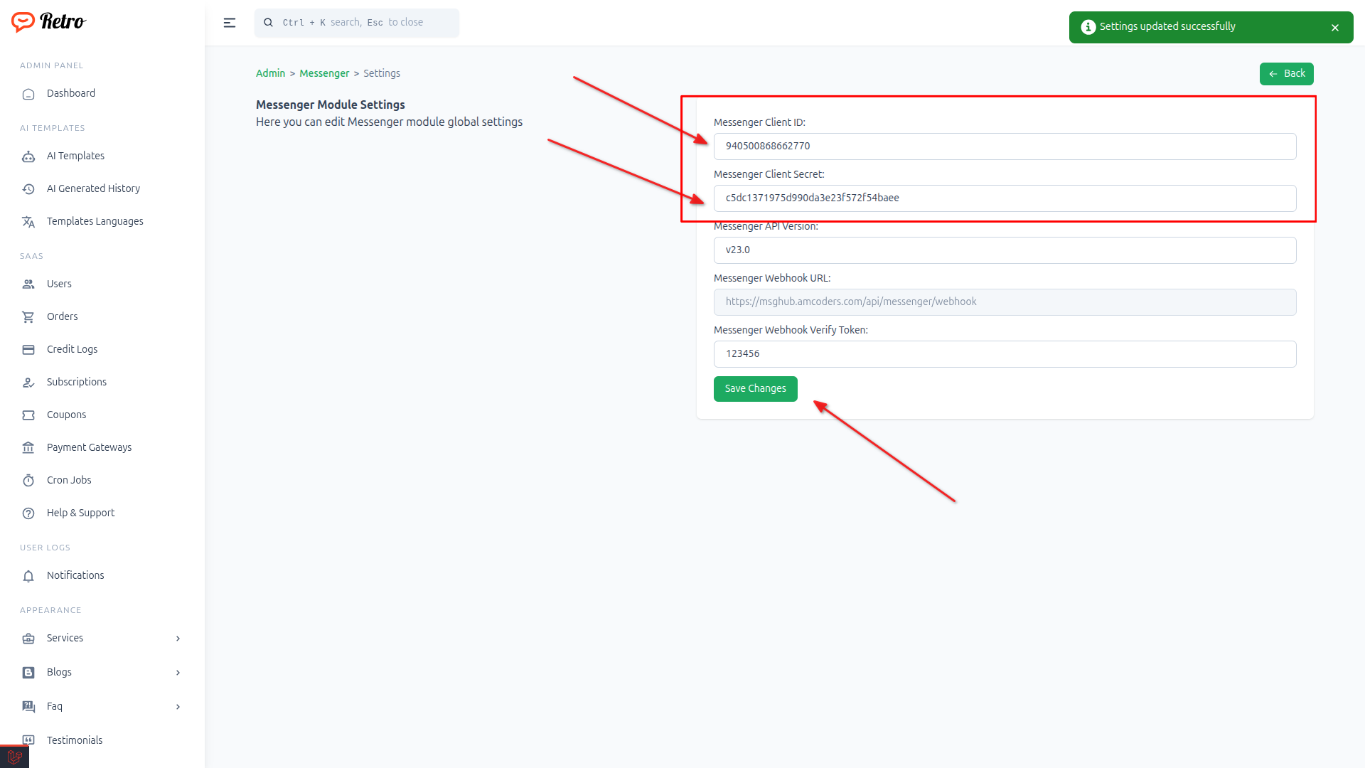 Paste App ID and App Secret in Messenger settings