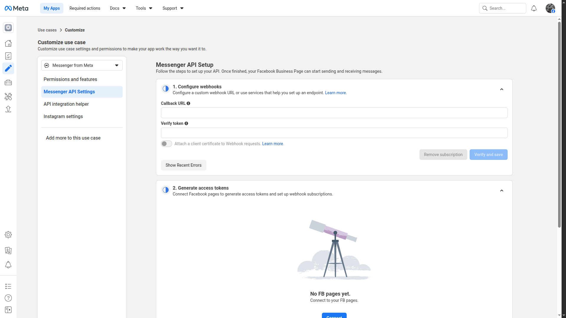 Messenger API Setup - Configure webhooks section