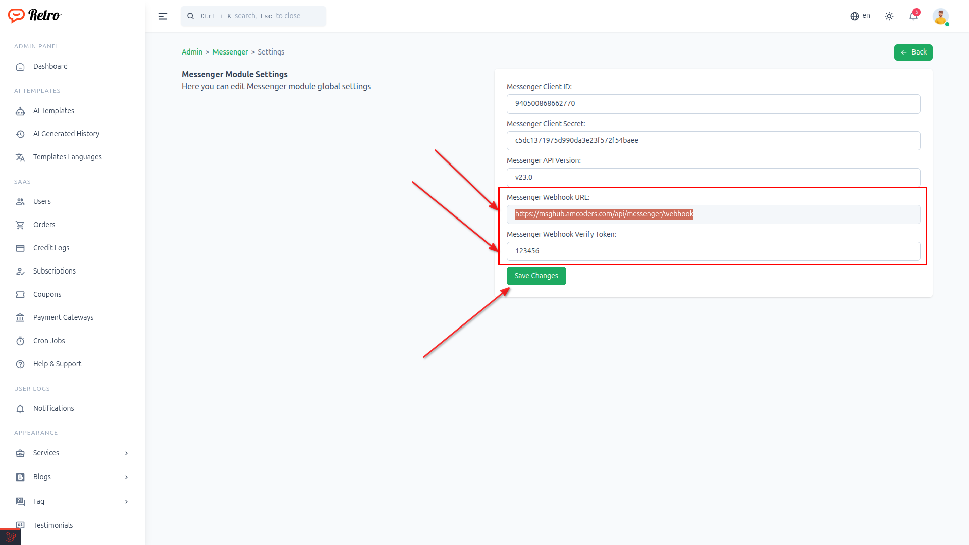 Copy webhook URL and verify token from settings