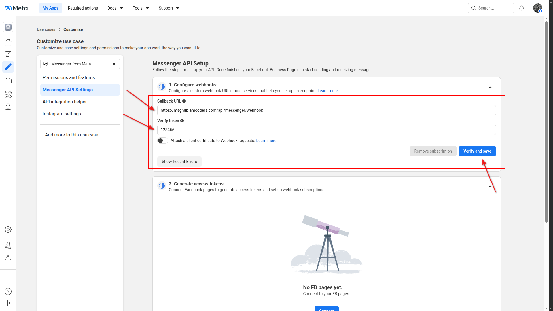 Paste webhook URL and verify token, then click Verify and save
