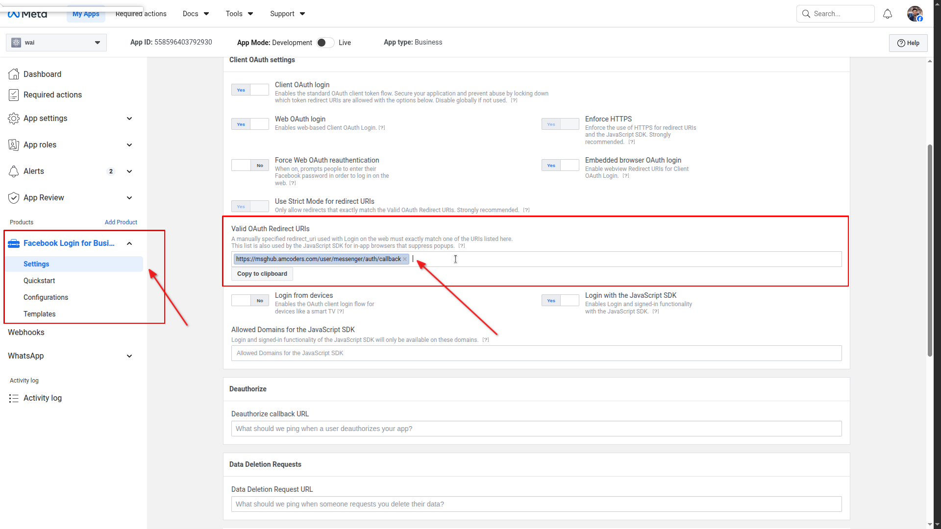 Paste in Valid OAuth Redirect URIs