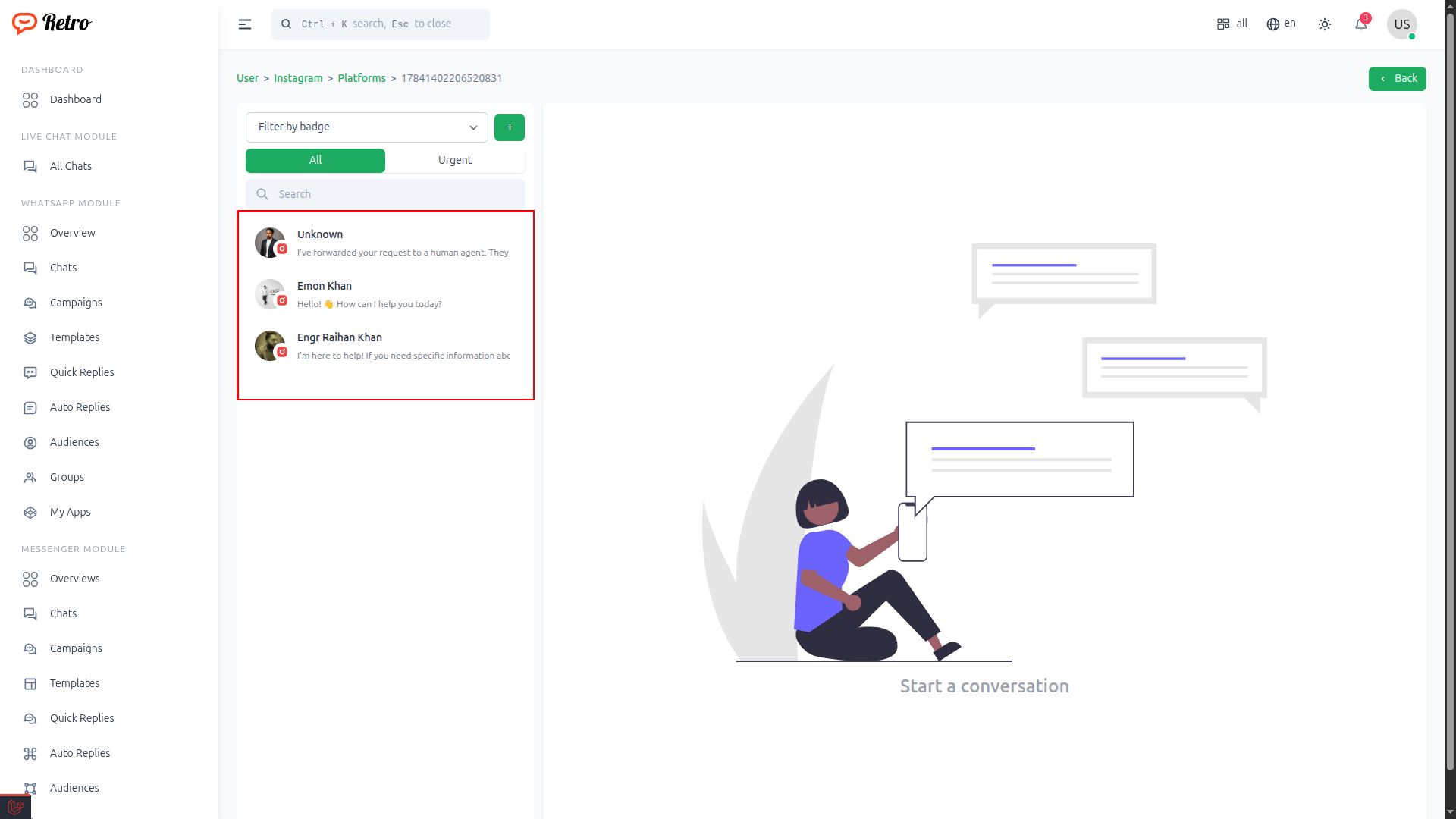 Open your browser & go to https://your-domain/user/instagram/chats