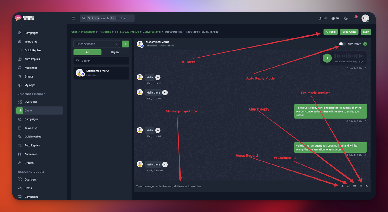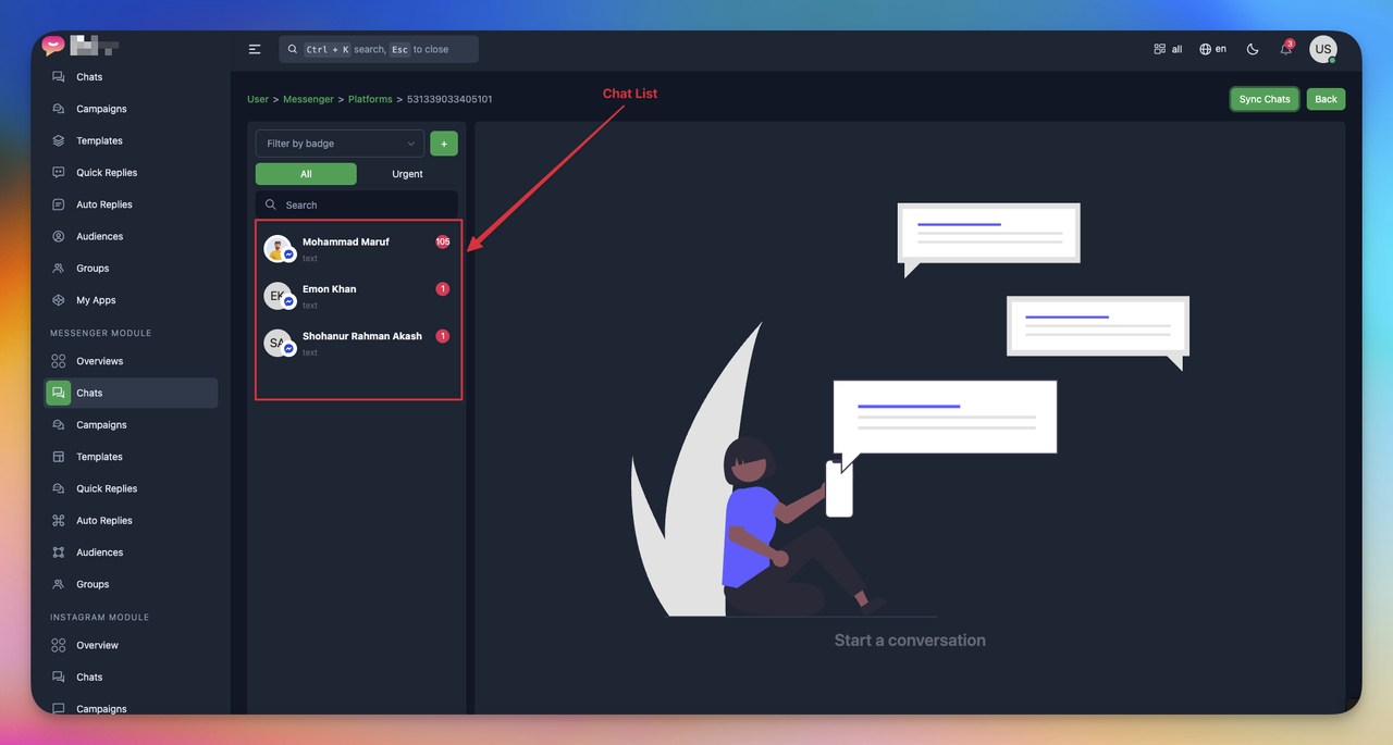 Or click to Chats from Messenger Module option from sidebar